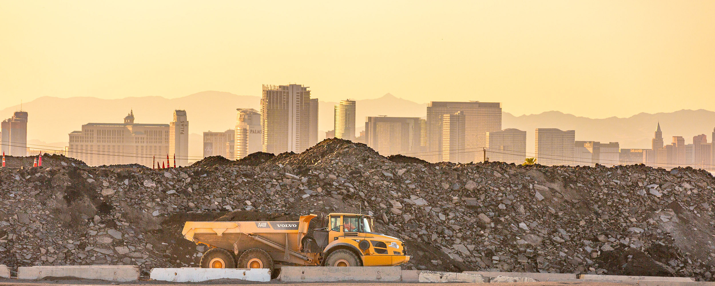 A dump truck driving in front of a pile of recycled asphalt with the Las Vegas strip in the background with amber tones.