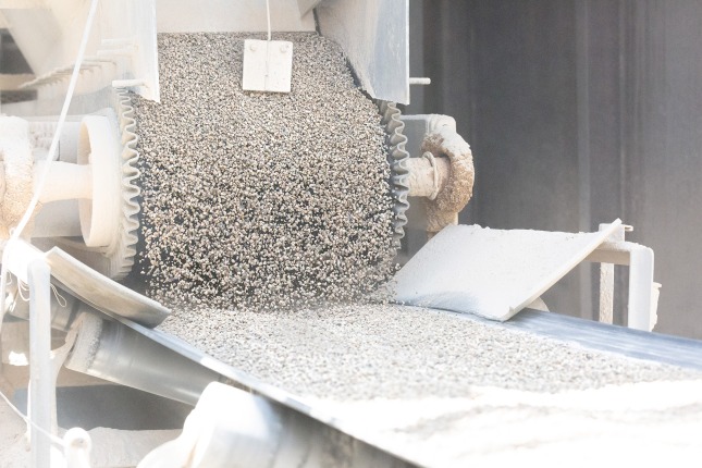 Aggregate falling onto a conveyor belt amidst dust.