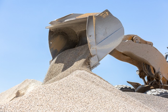 Closeup of a loader dumping aggregate into a pile.
