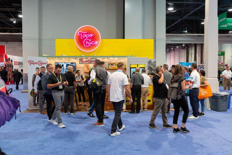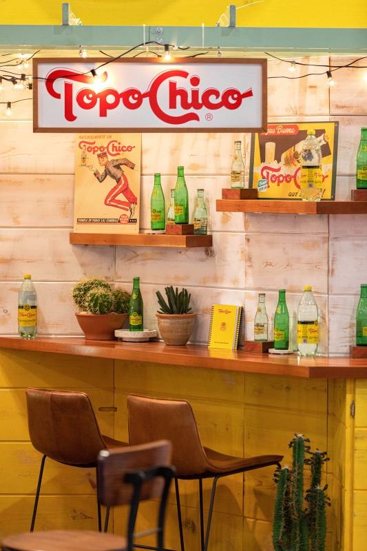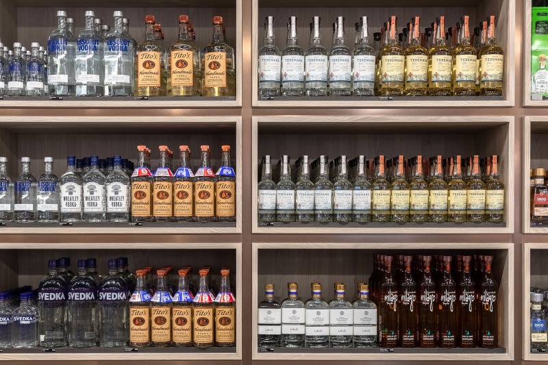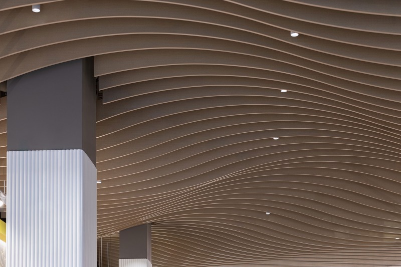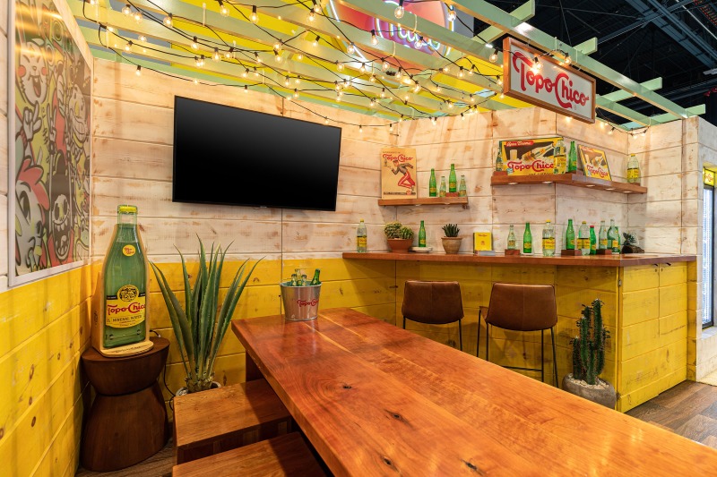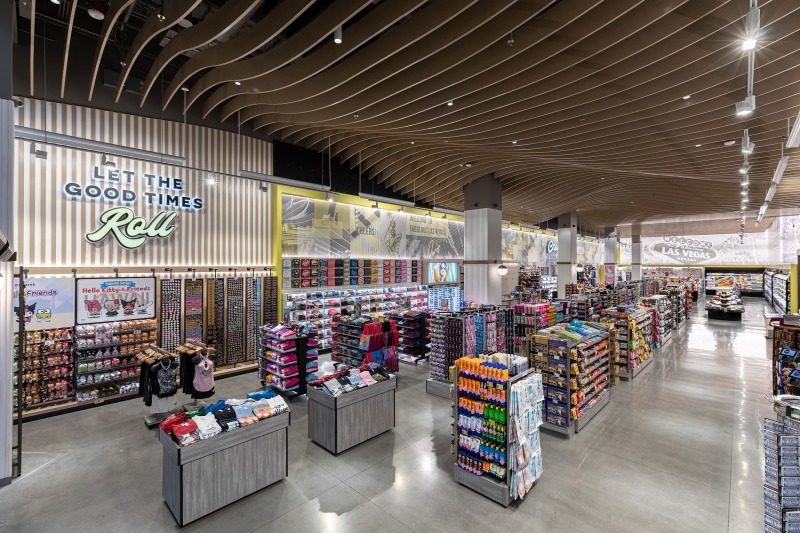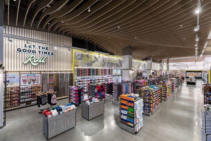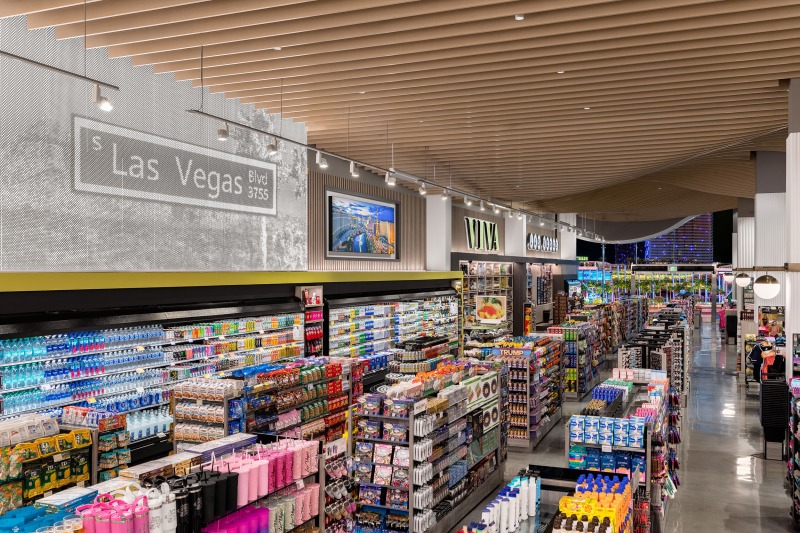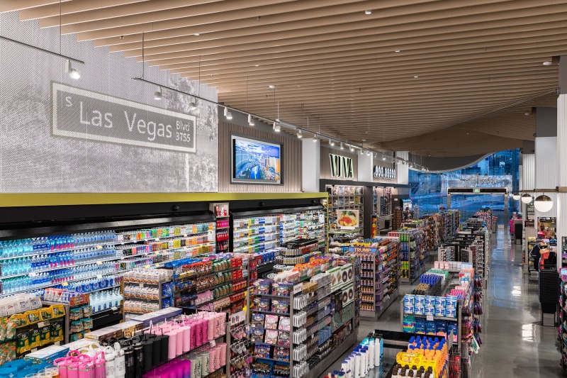 The interior, however, was the star of the show. Our objective was to highlight how ADM employed thoughtful design strategies and innovative products to create a fluid, functional, and beautiful retail space suitable for accommodating hordes of Vegas visitors. Ocean-like waves ripple through the ceiling panels, receding from the front of the store to the back like a shoreline. At the rear, a backlit halftone metal graphic of the Las Vegas sign anchors the space, while playful graphic prints line the walls, keeping the shop both tidy and fun.